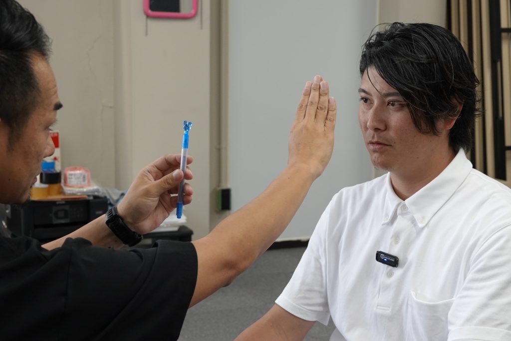 新井氏のこの一言から、宮國椋丞さんのビジョントレーニング体験が始まった。マークを使った簡単なチェックで、宮國さんの目は「外に行きやすい」傾向にあることが判明。この何気ない癖が、実はスポーツパフォーマンスに大きな影響を与えているという。